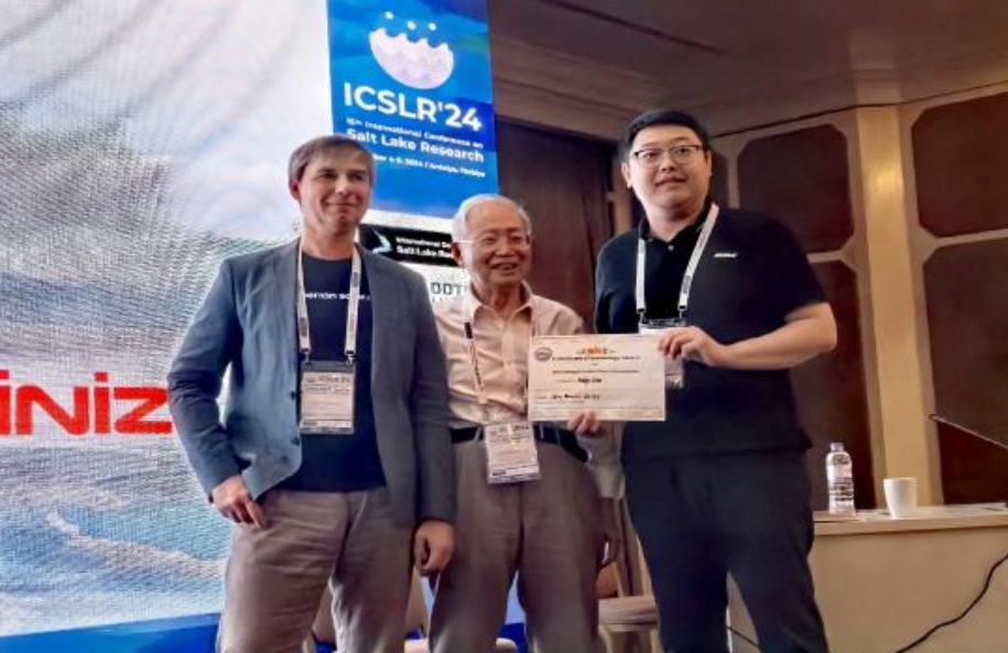 会上,国际盐湖学会主席Egor Zadereev宣布了第十五届国际盐湖会议青年学者威廉姆斯奖(William D. Williams Award)及盐湖学奖(Salinology Award)获得者,我校青年教师赵凯宇博士获得第十五届国际盐湖学会盐湖学奖(Salinology Award),国际盐湖学会副主席、中国工程院院士郑绵平为获奖者颁奖。